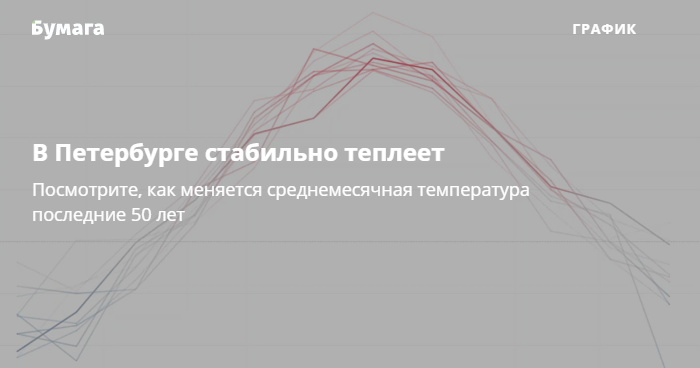 «Бумага» сделала аналогичную инфографику про погоду в Петербурге. На ней можно увидеть, как росла среднемесячная температура воздуха в городе последние 50 лет.