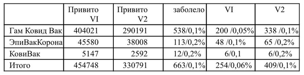 Аналогичное заявление выложил в чате добровольцев, участвовавших в исследовании эффективности «ЭпиВакКороны» пользователь, представляющий там позицию Роспотребнадзора. К нему была приложена таблица с раскладкой — сколько именно и какой вакциной привито человек в Новосибирской области, а также сколько из них заболело.
