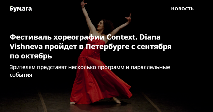 Международный фестиваль современной хореографии Context. Diana Vishneva проведут в Москве и Санкт-Петербурге этой осенью, сообщили «Бумаге» организаторы. В Петербурге постановки из основной программы события покажут со 2 сентября по 4 октября.