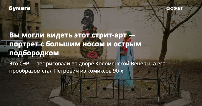 Возможно, вы встречали на петербургских улицах такой стрит-арт: профиль лица с большим носом и острым подбородком. Это СЭР — работа уличного художника из объединения «Новые уличные». Часть этих художников вы наверняка знаете как группировку «Осколки». «Бумага» рассказывает о мистическом СЭРе, о том, как появился тег и где его можно увидеть.