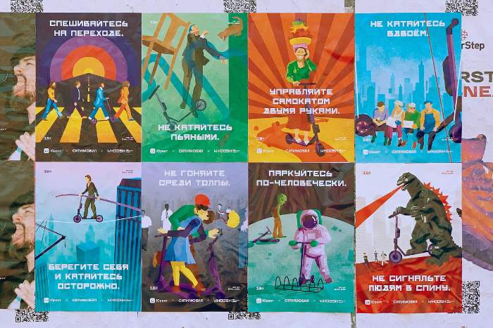 Плакаты созданы в рамках информационной кампании, которую ведут кикшеринги Urent, «Ситимобил» и Whoosh, рассказали «Бумаге» в пресс-службе Urent. «Наша задача – повышать культуру безопасного вождения, в том числе и в рамках таких проектов», — говорит основатель кикшеринга Whoosh Дмитрий Чуйко. Созданные постеры называют «первым этическим кодексом для пользователей электросамокатов».