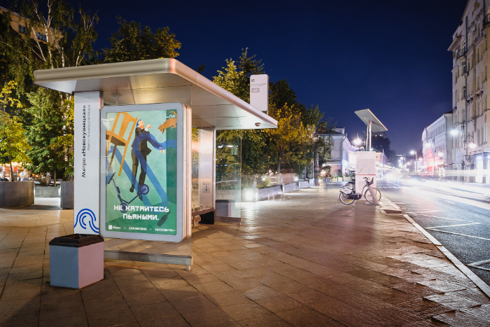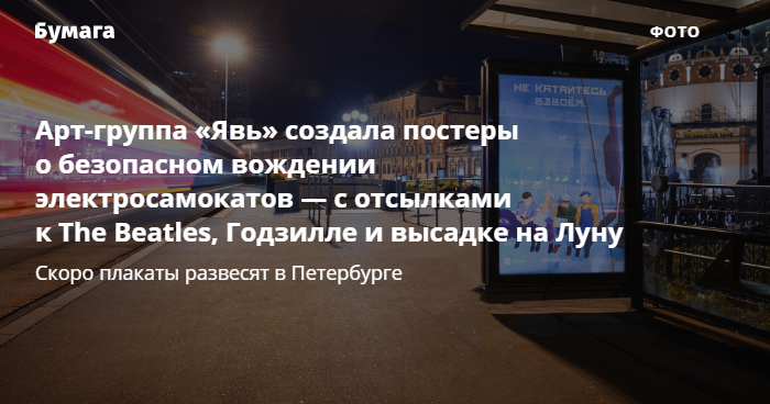 На плакатах написано восемь правил этичного поведения для пользователей электросамокатов: например, «спешивайтесь на переходе», «не катайтесь вдвоем», «паркуйтесь по-человечески» и «не сигнальте людям в спину». Постеры отсылают к знаменитой фотографии группы The Beatles на Эбби-Роуд, фотографии «Поцелуй на Таймс-сквер» Альберта Эйзенштадта, персонажу комиксов и фильмов Годзилле, а также высадке к на Луну и творчеству Сальвадора Дали.