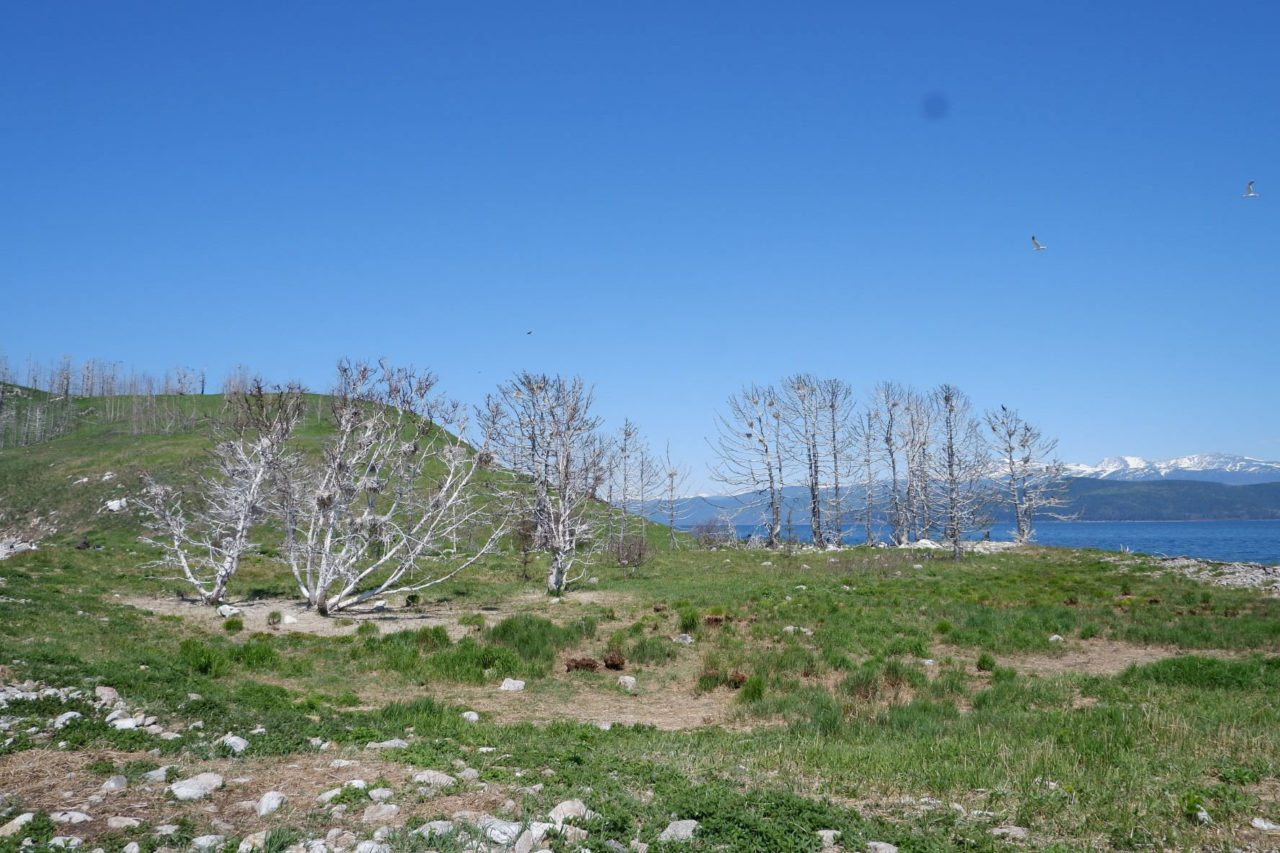Мы идем на остров Голый, излюбленное место обитания колоний большого баклана и монгольской чайки в Чивыркуйском заливе. Остров голый в прямом смысле: засохшие деревья, усыпанные гнездами, издалека кажутся искусственными.