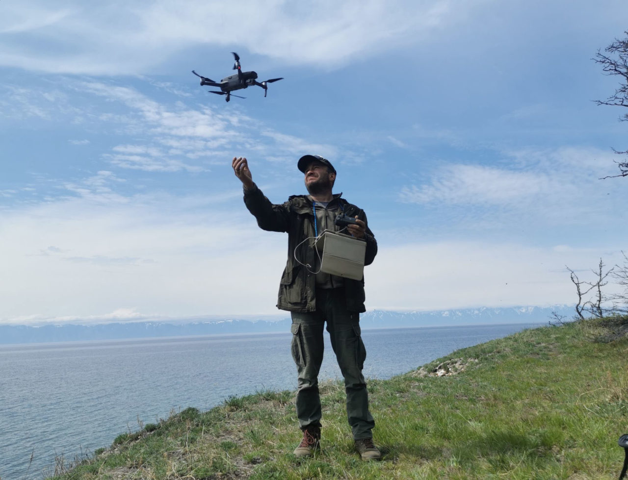 В традиционный метод учета нерпы Разуваев, как и в случае с бакланом, добавляет учет с воздуха. С квадрокоптера отлично видно не только нерп на берегу, но и тех, кто в воде (озеро прозрачное, видно даже, как нерпа «рулит» хвостом).