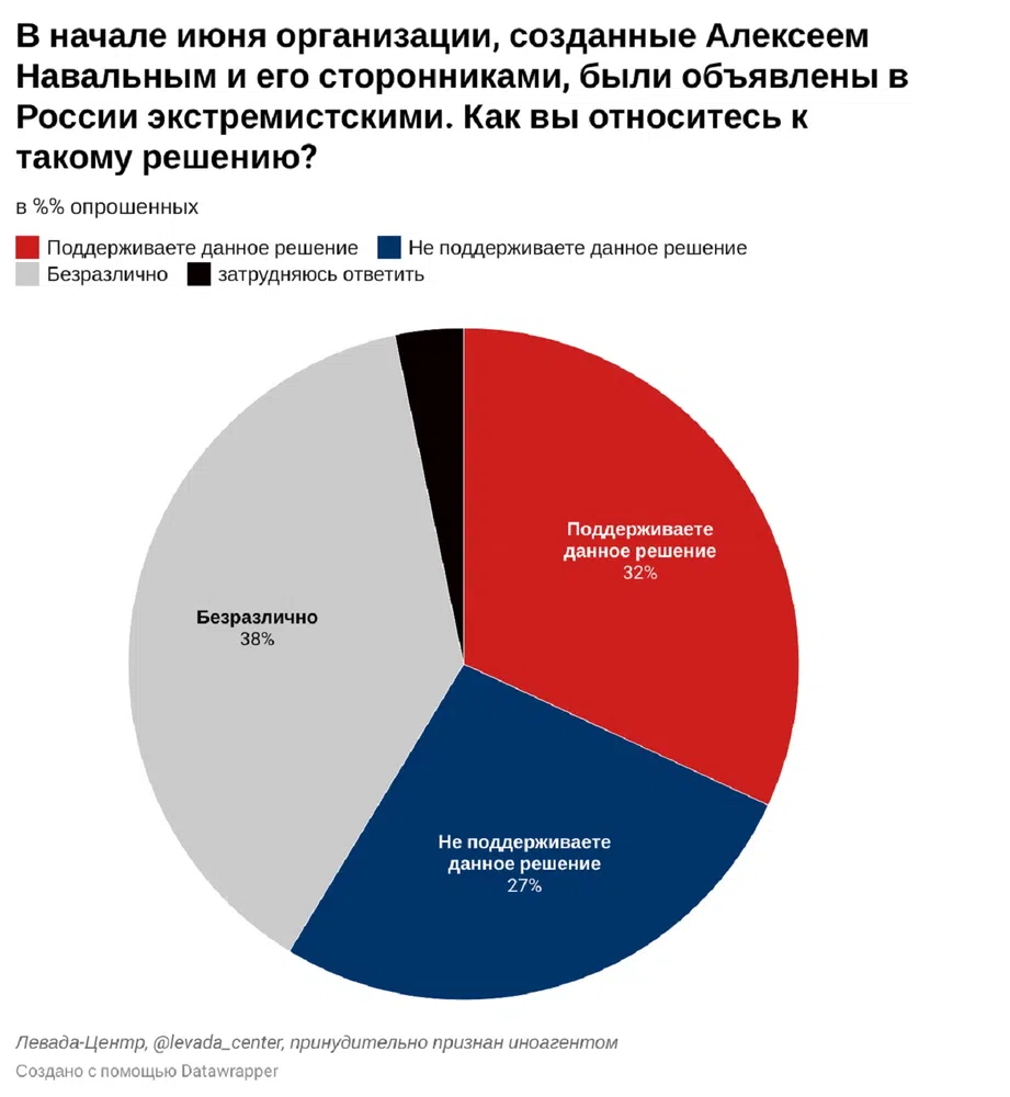 Треть россиян (32%) поддерживают решение Мосгорсуда, который признал ФБК и другие структуры политика Алексея Навального экстремистскими организациями, следует из опроса «Левада центра»* (есть в распоряжении «Новой газеты»).