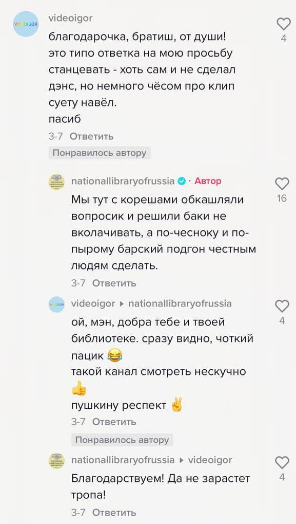 «Хотел уже удалить TikTok, но тут появились вы, спасибо!», «Кто бы мог подумать, что лучшим аккаунтом в TT станет аккаунт библиотеки».
