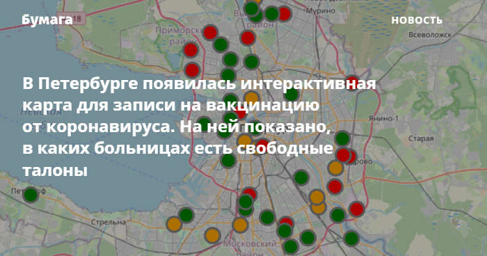 В Петербурге заработала интерактивная карта с визуализацией свободных слотов для записи в городских пунктах вакцинации от коронавируса. Она размещена на сайте СПб ГБУЗ «Медицинский информационно-аналитический центр».