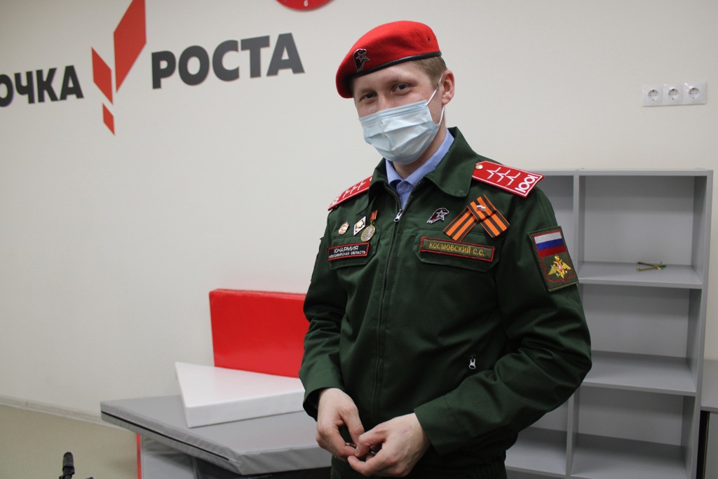 На странице Космовского множество фотографий с детьми в форме «Юнармии». Он, в частности, работал с учащимися местной школы №2.