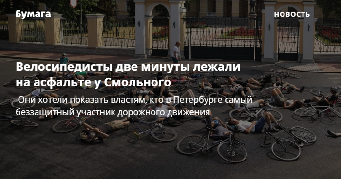 Около двух десятков петербургских велосипедистов провели акцию у Смольного: 11 июля они приехали к зданию правительства и вместе с велосипедами легли на асфальт. Как сообщили «Бумаге» организаторы, с помощью акции они хотели показать, что велосипедисты — самые беззащитные участники дорожного движения.