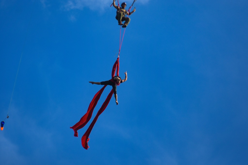 «Этот полет у нас особенный. Больше года прошло после нашего последнего полета во Вьетнаме, который закончился аварийной посадкой: меня тогда протащило по камням и кустам. Так что непросто было решиться на это снова. Еще и перед взлетом царил полный штиль, что добавляло беспокойства. По мне так пусть лучше дует сильный ветер, — поделилась Кулагина. — Сейчас я летала с новым снарядом: раньше были стропы, теперь полотна. Совершенно другая гимнастическая техника; к тому же ткани много, и она парусит. Было очень непросто. Но главное — мы справились! Мы первые это сделали!»