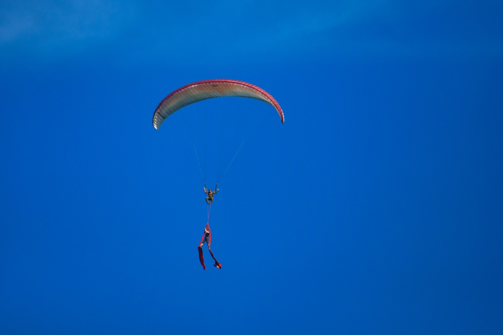 Новосибирский парапланерист Александр Орлов поднял на высоту около 800 метров гимнастку Анжелу Кулагину. Девушка исполнила акробатический номер на полотнах без страховки. Это первое исполнение подобного трюка в мире.
