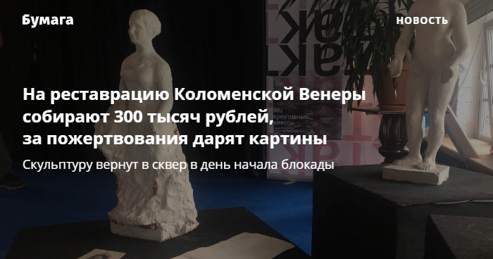 Добрососедское сообщество Коломны открыло на сайте Planeta.ru сбор средств на реставрацию Коломенской Венеры, передает корреспондент «Бумаги» с тематической пресс-конференции. Местные жители хотят собрать 300 тысяч рублей.