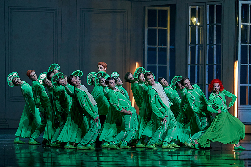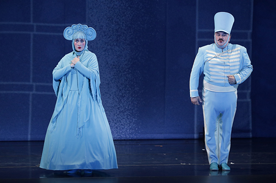 © Наташа Разина / Мариинский театр «Мавра» На верхней галерее застыл квартет оперных персонажей: голубые юбки колоколом, голубые же корсажи и голубые капоры-кокошники. Различить их было трудно, разве что по форме кокошников. Парашу пела Елена Стихина, и пела хорошо — с забавными придыханиями и еле слышным ойканьем, прерывавшим музыкальную фразу. С первого же номера — сентиментально-жеманного романса «Друг мой милый, красно солнышко мое…» — стало ясно, что она точно попадает в ернический стиль Стравинского. Романс, как полагается, был прерван напористым и бурным пением бравого Гусара — «Колокольчики звенят, барабанчики гремят…» в исполнении Евгения Акимова. Внизу плясали голубые юноши и девушки, почти сливаясь с фоном. Слегка оживляли происходящее регулярные проходки Стравинского с Дягилевым, которые продолжали ожесточенно браниться и разбрасывать окрест себя партитурные листы — хотя в десятый раз это было уже совсем не смешно. Финальная, феерически забавная сцена с разоблачением Гусара и чисто буффонной суматохой оказалась смазана и сценически невыразительно проартикулирована: удалой Гусар бежал, задрав юбки, вслед ему несся истошный крик Параши-Стихиной: «Василий!» В результате опера показалась какой-то незавершенной.