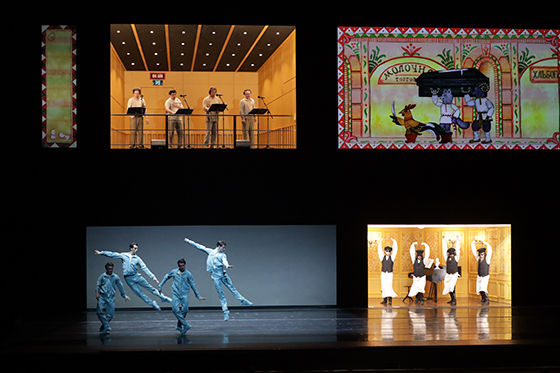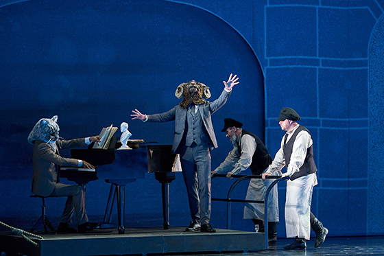 «Байка» поставлена затейливо: зеркало сцены разделили на два уровня и четыре равновеликие комнаты, в каждой из которых протекала весьма интересная жизнь. Сценическая, жанровая, пластическая полифония зрелища впечатляла: внизу был устроен элегантный музыкальный салон с роялем, за которым сидел сам Стравинский, а щеголь Дягилев с узнаваемой белой прядью в черной шевелюре распевал романсы и отчаянно спорил с визави, тыча пальцем в ноты. Иногда Стравинский и Дягилев уступали место за роялем Коту и Барану — персонажам «Байки». Там же, в салоне, ни с того ни с сего — видимо, для усугубления фантасмагоричности происходящего — залихватски плясали дворники в картузах и белых фартуках. То была явная отсылка к совсем другой опере: «Нос» Шостаковича с его восемью дворниками — один из самых важных петербургских текстов, вымощенный гоголевским сардоническим юмором.