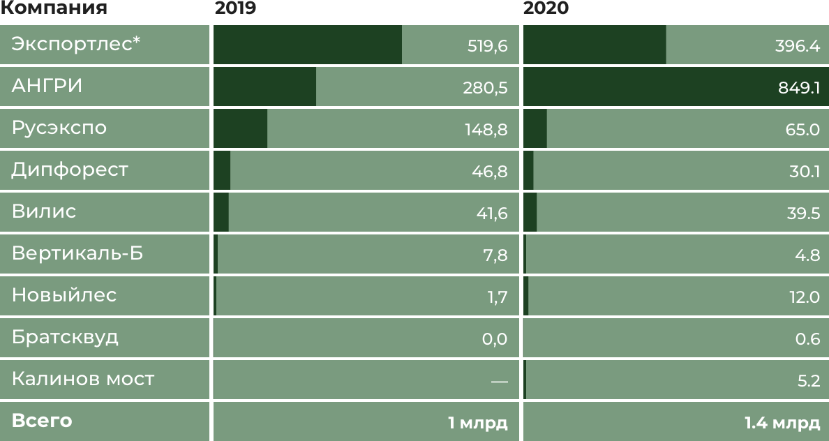 Крупнейший заготовитель среди компаний Бакурова — «Вилис» — благодаря дополнительным соглашениям в 2012-2018 годах получила разрешение на заготовку более 160 тыс. кубометров древесины, но это только малая часть от реального объема. По данным самой компании, в защитных лесах она вырубила около 750 тыс. кубометров — за 2014-2019 годы. Это значит, что либо «Вилис» имела еще какие-то формальные разрешительные документы на проведение санитарных рубок, либо компания включила в отчеты древесину от рубок, поступивших из источников вне своих арендных участков.
