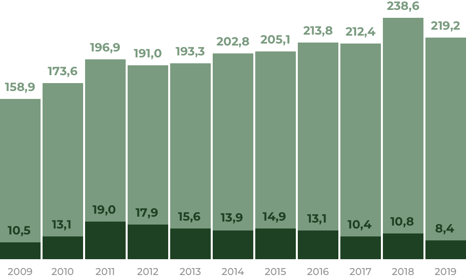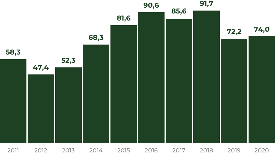 Что важно — в течение этого периода не падал объем санитарных рубок у компаний Бакурова. С 2012 по 2018 годы они заключали дополнительные соглашения, удваивавшие объем леса, который они могли срубить — к 90 тыс. кубометров в год добавились еще 689 тыс., согласно заключению Earthsight, основанному на анализе дополнительных соглашений группы компаний Евгения Бакурова. Рубки компаний в большинстве случаев проходили в защитных лесах, где промышленная заготовка леса вообще запрещена: в 2009-2020 годах общая площадь вырубок в защитных лесах составила 14,6 тыс. гектаров, в эксплуатационных (то есть тех, где можно заготовлять лес) — около 4 тыс. гектаров , заключает Earthsight. С 2011 по 2020 годы пять компаний депутата вырубили защитного леса объемом в 2,16 млн кубических метров — в три раза больше, чем было разрешено по сомнительным допсоглашениям , говорится в докладе Earthsight. Стоимость этого леса эксперты оценивают в четверть миллиарда долларов или 18,5 млрд рублей.