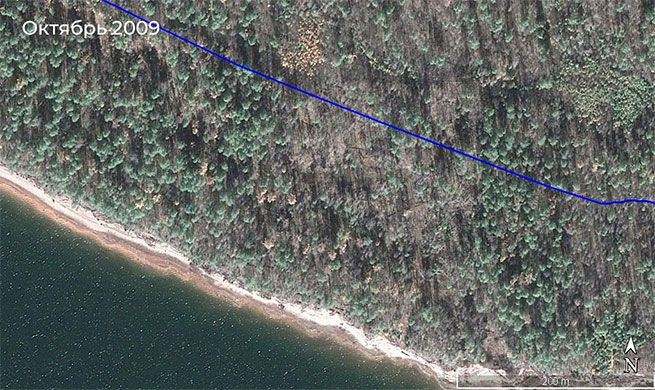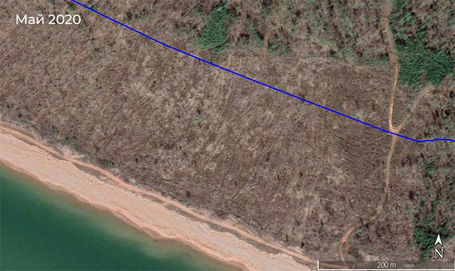 Сплошная вырубка 2012-2013 гг. в водоохранной зоне на северо-восточном побережье залива Кама. За семь лет, прошедших с рубки, лес так и не восстановился. Снимки Google Earth из расследования Earthsight.