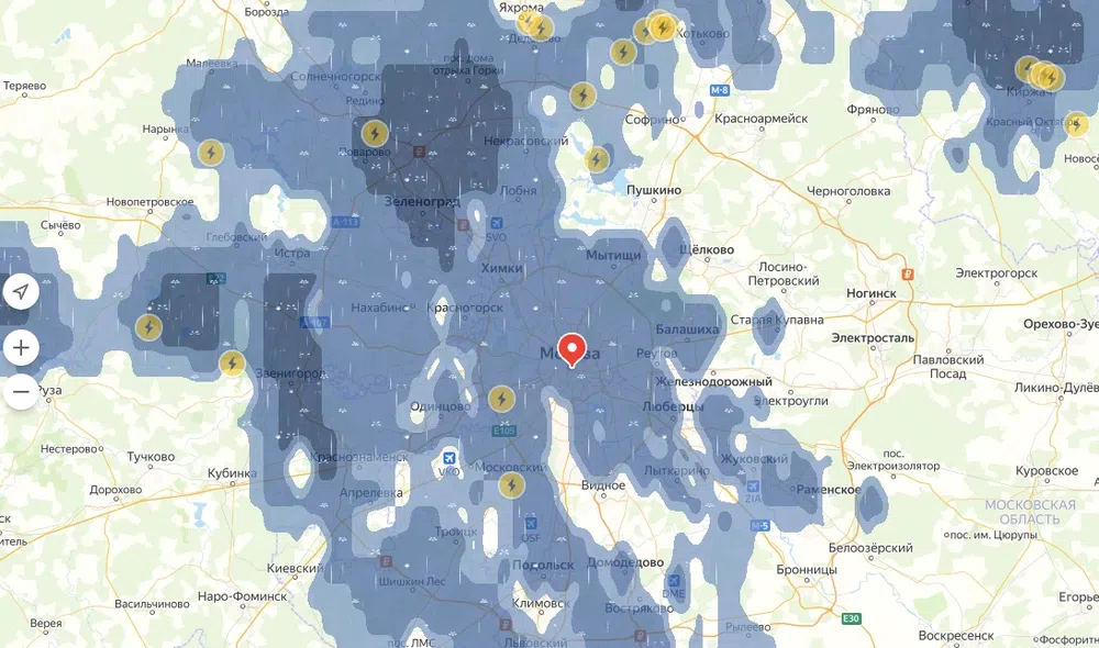 Согласно карте осадков «Яндекса», ливни и грозы начались практически по всей Москве, а также на большей части ближайшего Подмосковья. По информации источника ТАСС, сейчас в столице затоплено около десяти улиц. Карта осадков «Яндекса» отмечает, что в ближайшие два часа дождь в столице не прекратится.