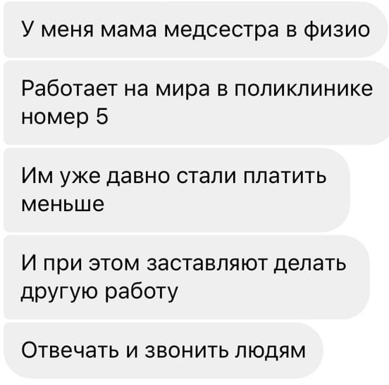 «Мы числимся как санитары-уборщики, то есть у нас две ставки. Но часы нам "закрывают" в основном как уборщикам. Срезали баллы, убрали региональные выплаты. Объясняют так: не поступают деньги, звоните в Минздрав. В Минздраве говорят: мы вам все перечисляем.