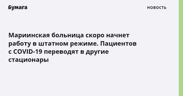 Мариинская больница готовится к старту работы в штатном режиме и переводит пациентов с COVID-19 в другие стационары. Об этом «Бумаге» рассказал источник, позже информацию опубликовали в соцсетях учреждения.