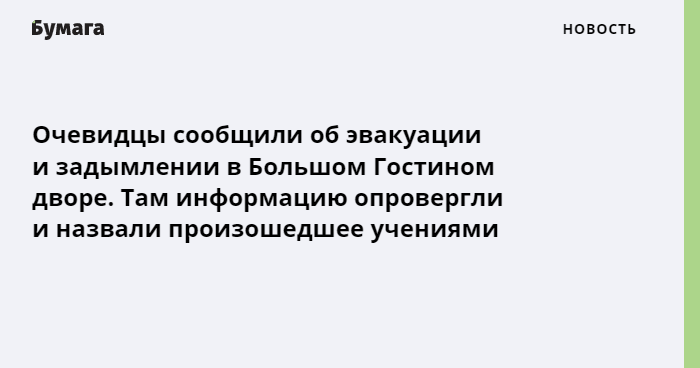 Издание «РБК» со ссылкой на очевидцев сообщило о задымлении в Большом Гостином дворе и эвакуации людей. В универмаге «Бумаге» эту информацию не подтвердили.