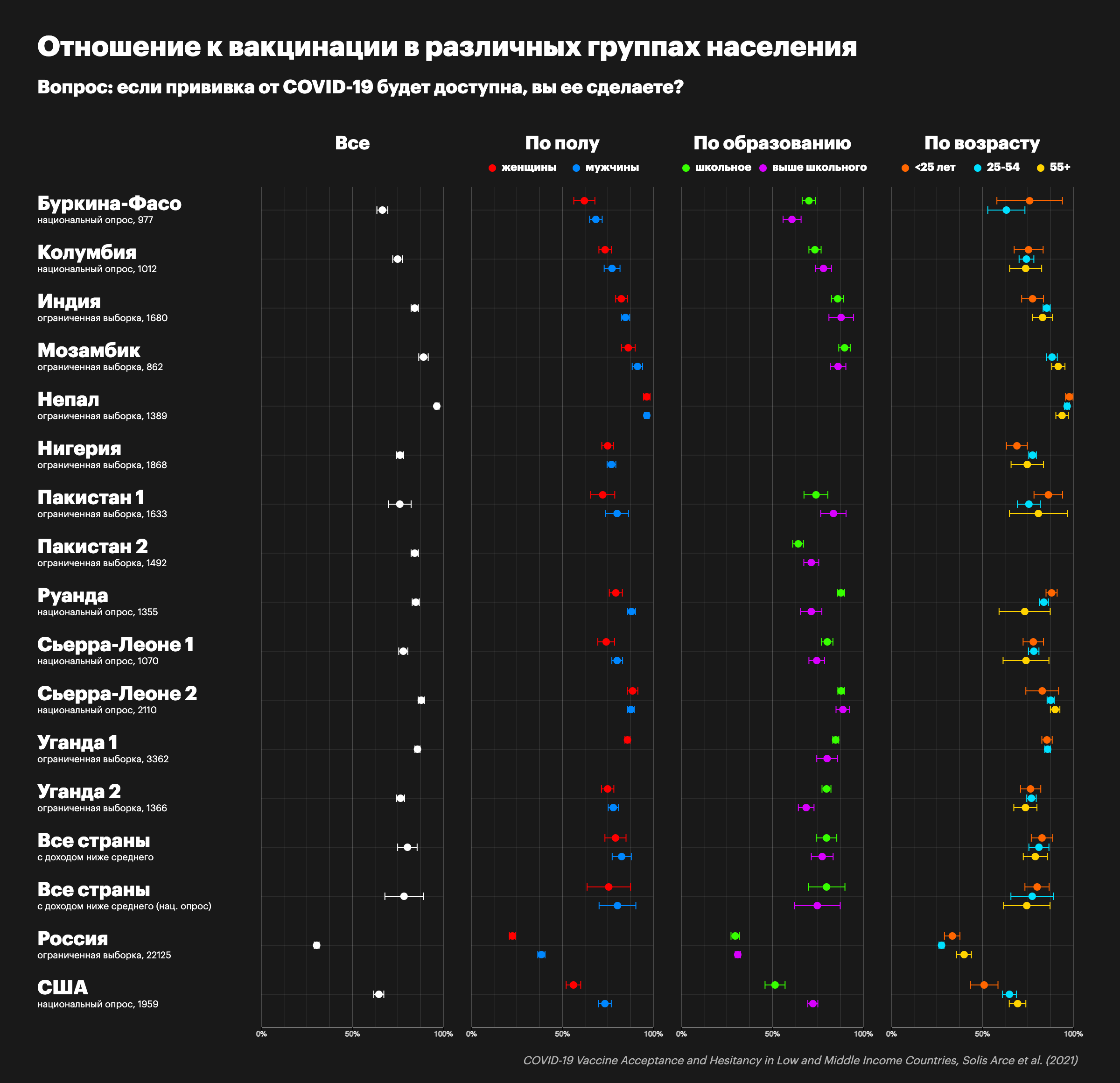 Совсем другая картина в бедных странах, где только ждут помощи с вакцинацией. Среднее значение там — около 80%, то есть вакцину ждут именно столько людей, сколько нужно для достижения минимального порога массовой вакцинации, то есть «коллективного иммунитета».