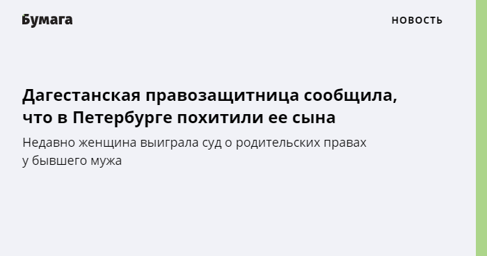 Правозащитница Нина Церетилова рассказала, что днем 17 июля неизвестные похитили ее старшего сына Мухтара. Он был в Петербурге с дядей, на которого оформлена доверенность, пока женщина участвовала в судебных заседаниях в Дагестане.