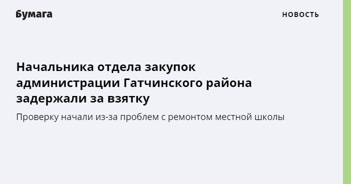 СК отмечает, что мужчине дали взятку за беспрепятственное заключения контрактов. По данным 47news, деньги передал предприниматель, который был субподрядчиком при ремонте школы в поселке Лукаши. С учебным заведением связан скандал — после ремонта там остались плесень и грибок, а директору грозили увольнением за отказ принять работы. «Бумага» подробно рассказывала о ситуации.