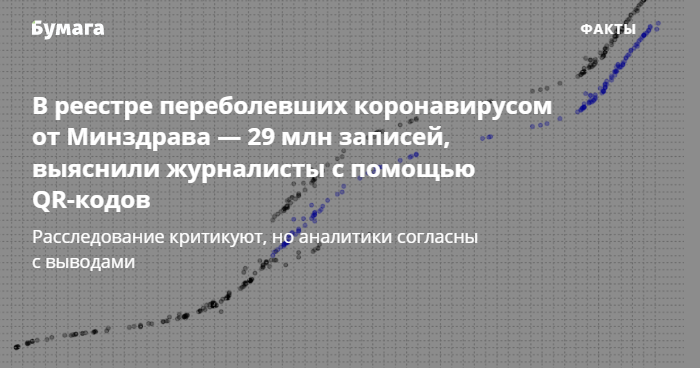 В Москве три недели действовала система QR-кодов, которые могли получить не только вакцинированные, но и переболевшие. В самих кодах, рассылаемых россиянам, оказались зашифрованы статистические показатели из федеральных реестров. Например, в реестре Минздрава, созданном для отслеживания числа заболевших коронавирусом, оказалось 29 миллионов записей. Это в пять раз больше официального количества случаев заражения COVID-19, о котором сообщает оперативный штаб, обнаружили журналисты «Медузы», «Холода» и «Медиазоны». При этом в статистику попадают разные категории граждан. А оперштаб отрицает, что реестр может отражать реальное число переболевших.