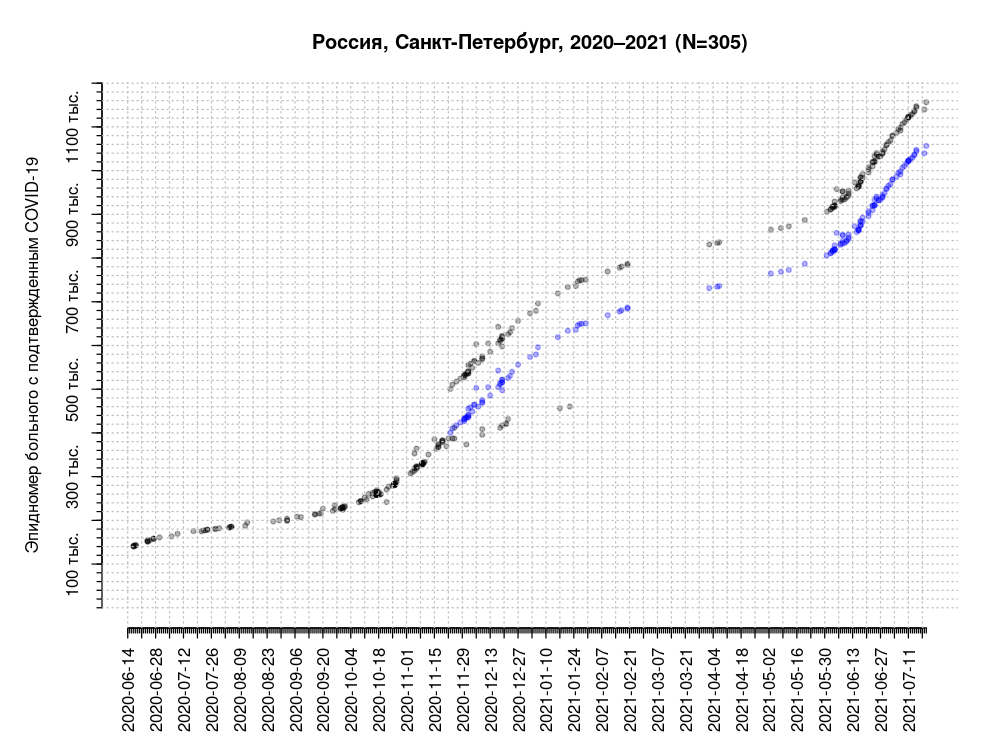 В Петербурге тоже ведут альтернативную статистику по косвенным признакам — эпидномерам. Этим занимается Алексей Куприянов, кандидат биологических наук, независимый аналитик, сооснователь сообщества Watching COVID-2019.ru. Он собирает эпидномера, которые выдают по результатам диагноза, основанного на положительном ПЦР-тесте на SARS-CoV-2 или КТ с характерным поражением легких. Исследователь получает их от знакомых и подписчиков в социальных сетях.