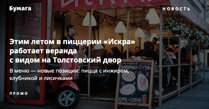 В пиццерии «Искра» на Рубинштейна, 30 всё лето будет работать открытая веранда с видом на Толстовский двор. Кроме того, в июле в меню появились новые позиции: пицца с инжиром и страчателлой, с клубникой и с лисичками. К каждому завтраку сейчас подают комплимент от заведения — бокал игристого вина.