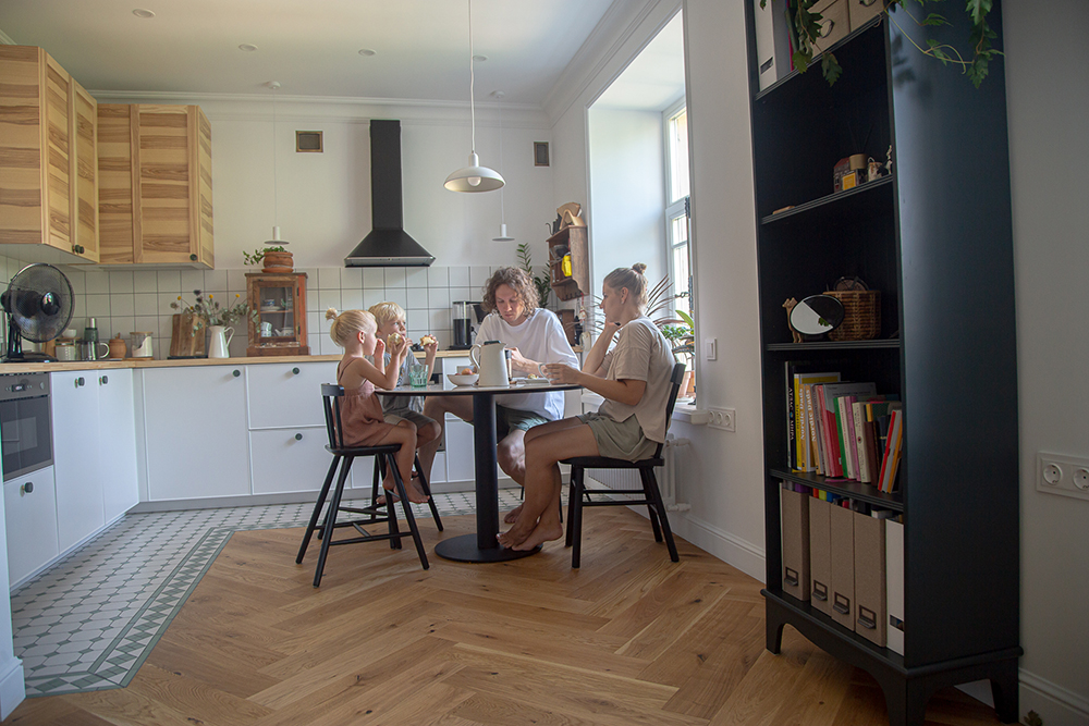 В итоге, я считаю, всё совпало идеально. Наш дом 1906 года находится на улице, которая раньше называлась Гулярной, а потом ее переименовали в честь советской деятельницы Лизы Чайкиной. Я не люблю самый центр города, где много туристов и тусовок, а здесь тихо и достаточно зелено. Будущая школа нашего сына находится в пяти минутах пешком, рядом есть садик с системой Монтессори для младшей дочки.