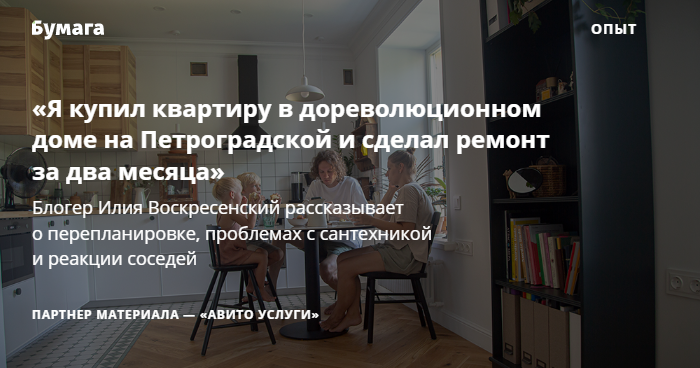 Для партнерского материала с сервисом «Авито Услуги» «Бумага» поговорила с Илией Воскресенским. Он рассказывает, как во время ремонта нашел в шкафу 2800 долларов, каким образом решил проблему с трещинами на потолке у соседей, которые образовались в процессе работ, и в чем прелесть дореволюционного жилья в Петербурге.