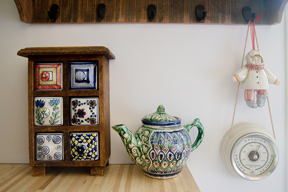 Кроме того, я стараюсь привозить вещи из путешествий, чтобы интерьер ассоциировался с какими-то жизненными моментами, — так рождается уют. Например, давным-давно на блошином рынке в Исландии я купил ящик из-под специй. Он маленький, с узорами и очень классно вписывается на кухню. А из Австрии мы привезли рога горного козла — купили их в магазине у дороги в горах.