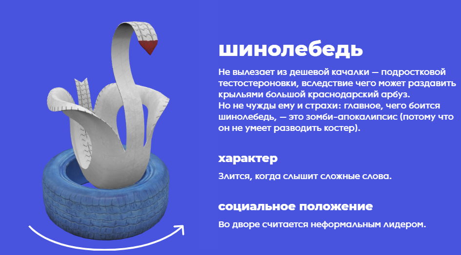 На сайте есть несколько разделов. Например, «Бестиарий» — это словарь с описанием популярных дворовых объектов. Там в шуточной форме рассказывается, чем лебедь из шин отличается от солнца, сделанного из бутылок.