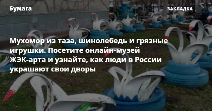 Креативное бюро «Золотые тигры России» открыло онлайн-музей ЖЭК-арта. Стартовая страница сайта — это панорама типичного российского двора, который украшен фигурами из покрышек и пятилитровых бутылок, а также разрисованными пнями.
