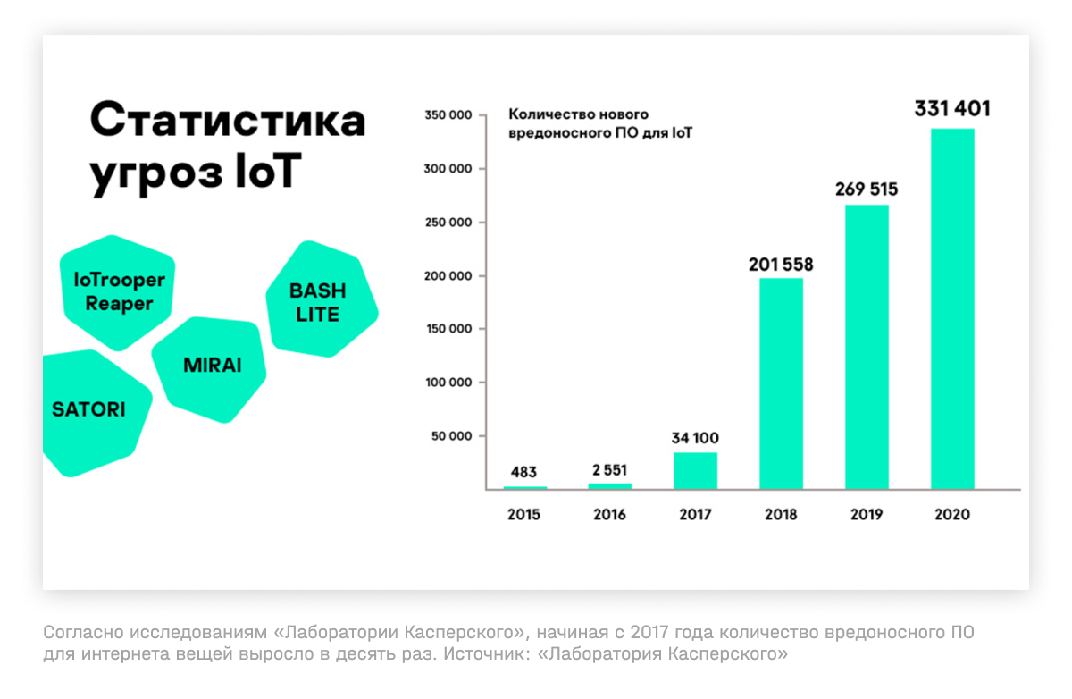 С ростом числа подключенных к интернету устройств растет и внимание к IoT злоумышленников. «Лаборатория Касперского» регулярно обнаруживает новые виды угроз для интернета вещей. За три года их количество выросло почти на порядок.