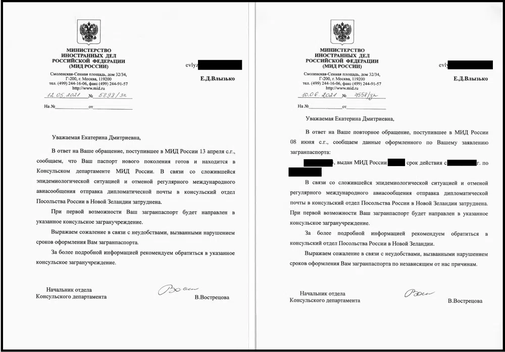 Паспорт Екатерины до сих пор находится в Москве. Пытаясь выяснить, почему МИД не отправляет диппочтой паспорта из России в Новую Зеландию, девушка писала обращения и в консульство, и в МИД: «В чем причина — не объясняют. Говорят, что нарушено авиасообщение, хотя это не так. Насколько я знаю, дипломатам можно въезжать в страну, несмотря на то, что Новая Зеландия закрыта. Возможно, они не хотят, чтобы тот человек из диппочты сидел две недели в карантине».