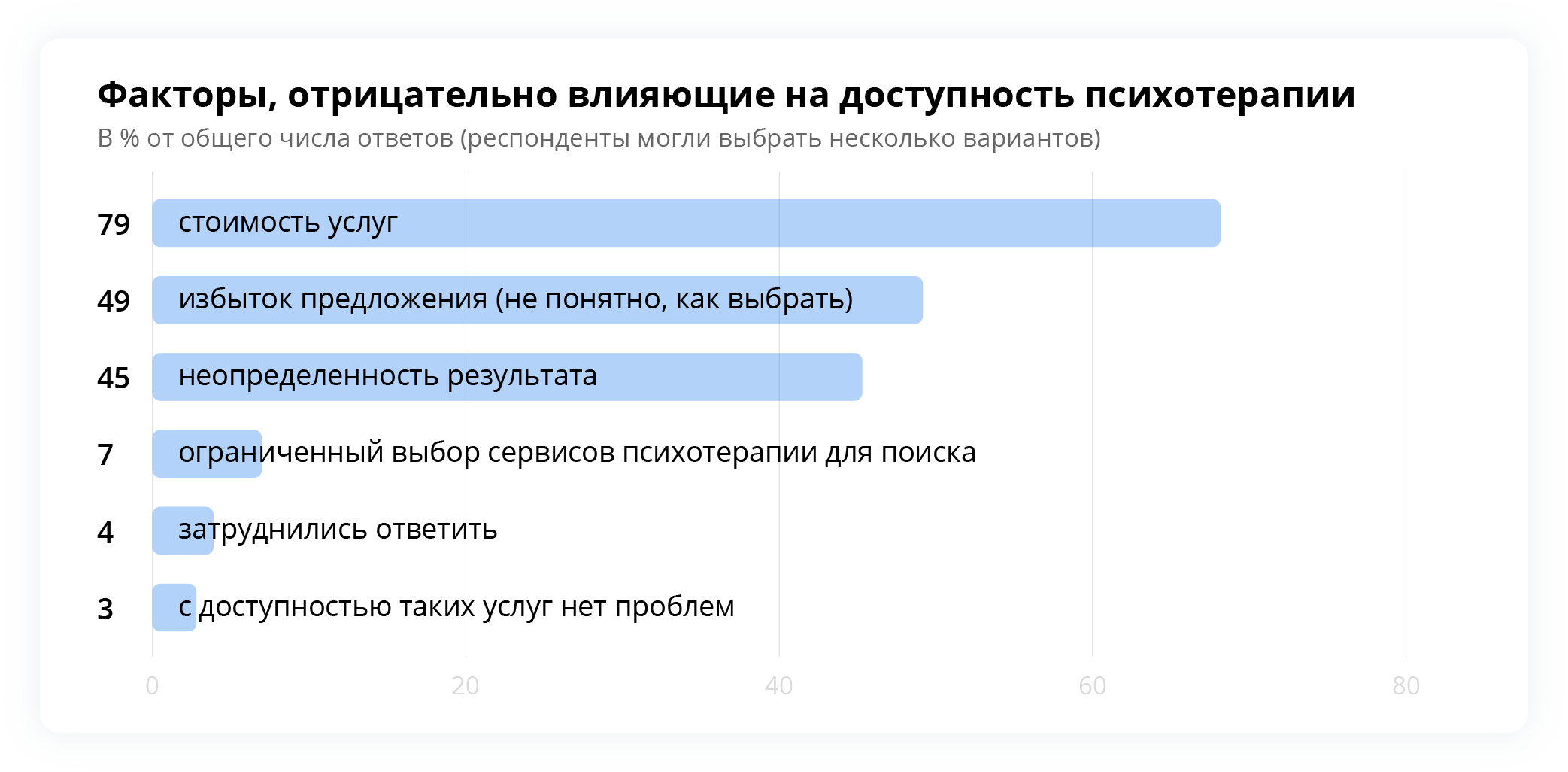 Другая распространенная проблема, которую отмечают респонденты, — сложность в выборе специалиста и неопределенность конечного результата психотерапии.