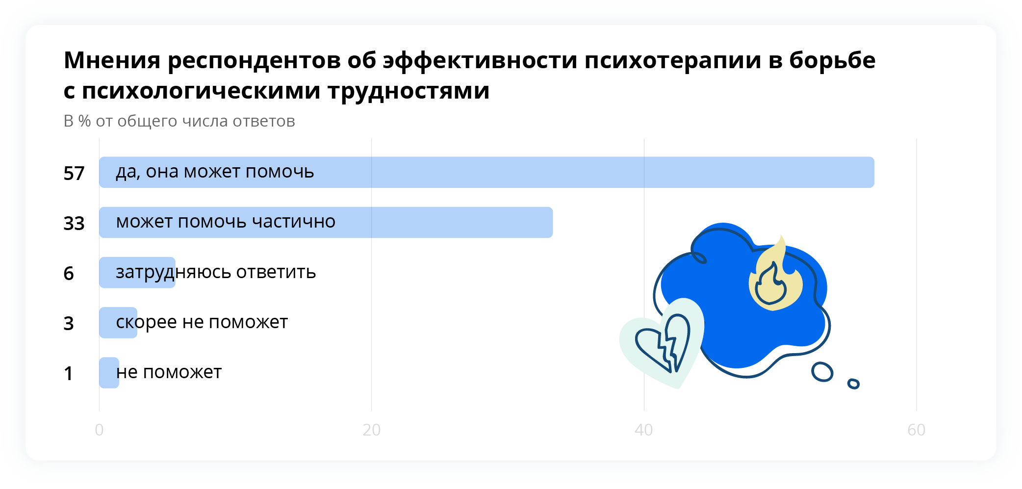 На вопрос о том, изменился ли уровень предубеждений в отношении психотерапии в последние годы, 73 % респондентов отметили, что он стал ниже, 11 % считают, что ничего не изменилось, 4 % — что предрассудков стало больше.