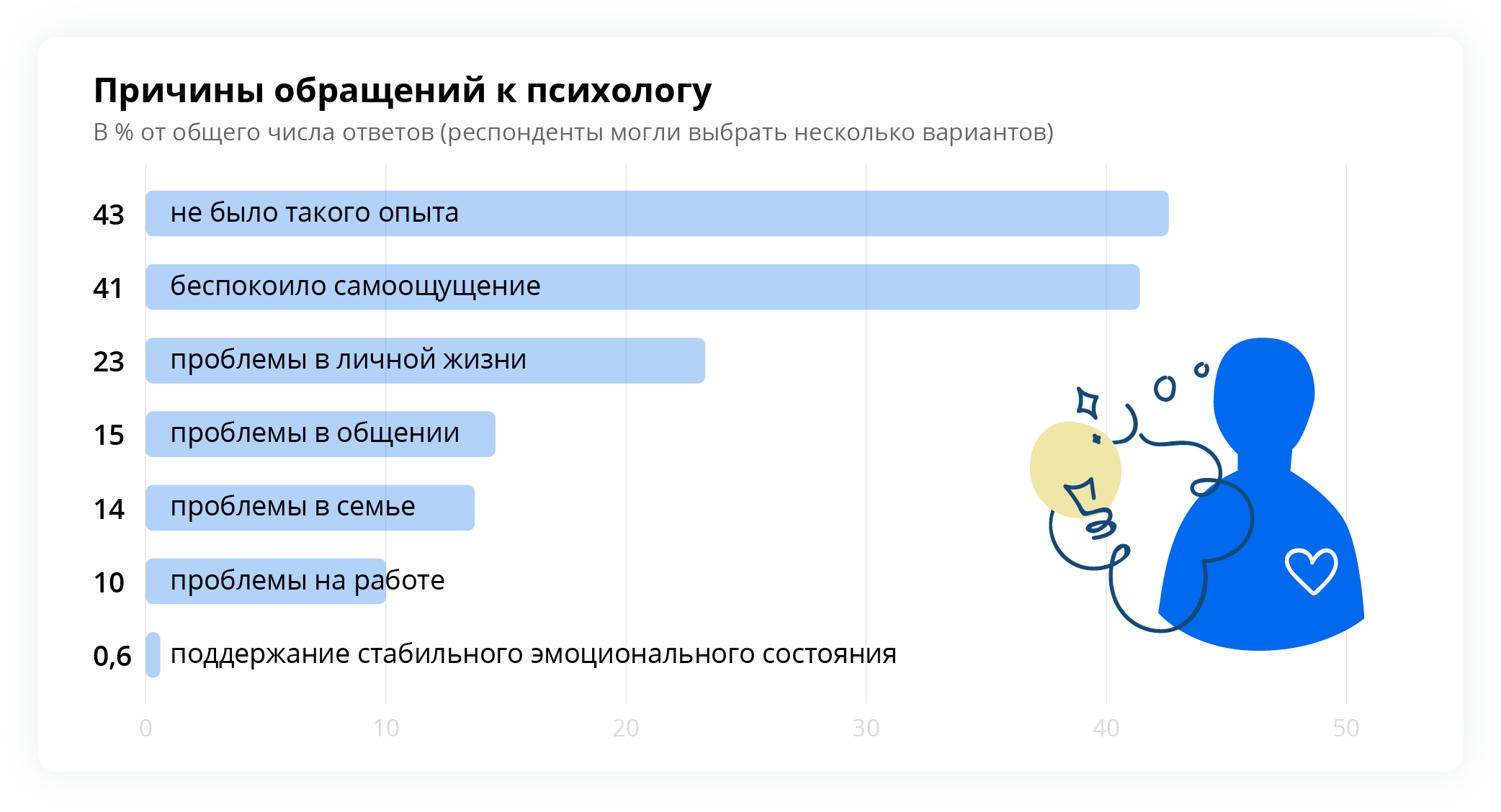 Самая частая причина обращения к специалисту — негативные ощущения: тревога, неуверенность. Из-за этого с психотерапевтом хотя бы однажды работали 41 % респондентов. Другие популярные причины — проблемы в личной жизни и общении, трудности в семье и на работе.