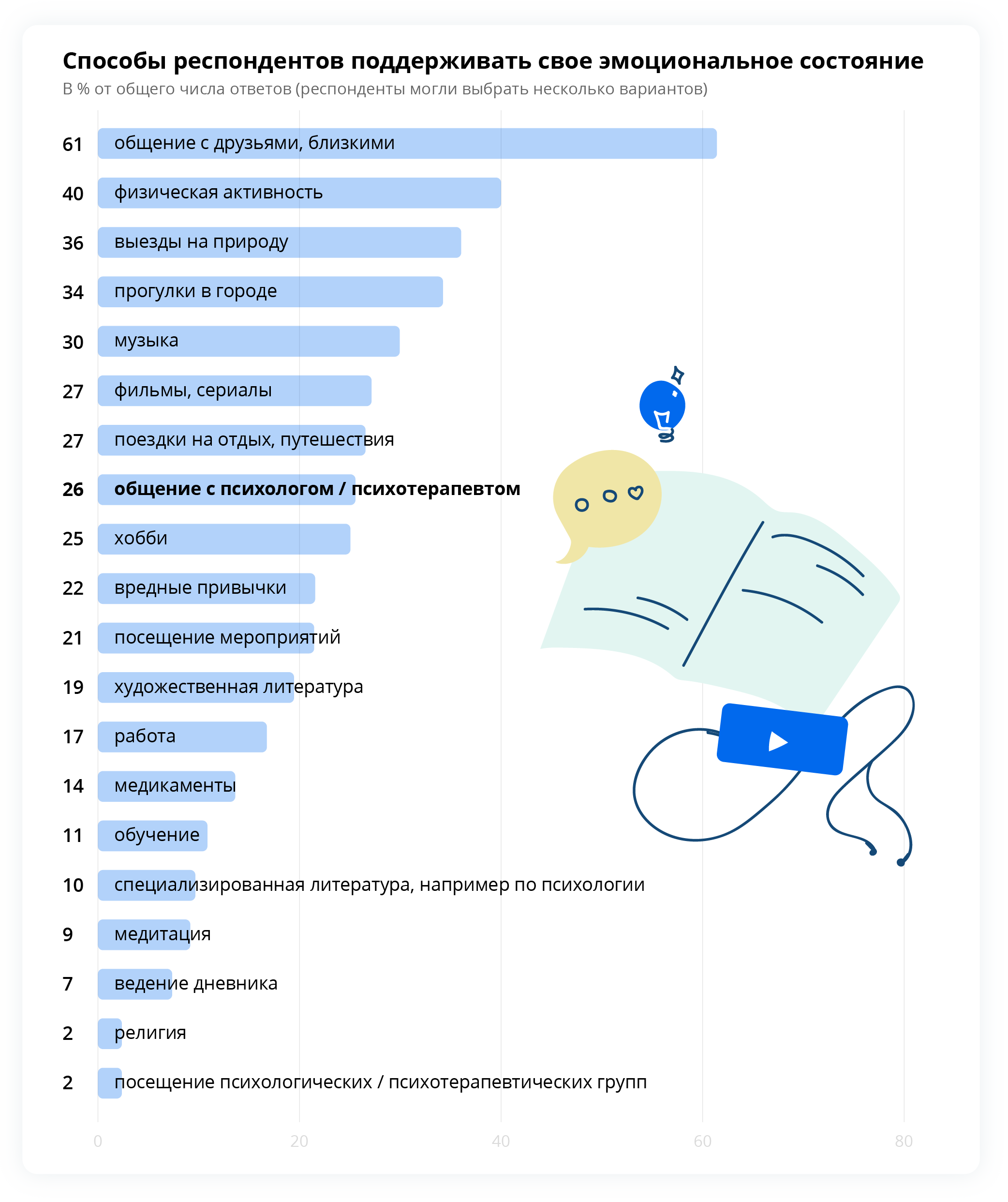 Больше половины опрошенных (61 %) предпринимают осознанные меры, чтобы поддерживать комфортное эмоциональное состояние. Самые популярные способы — общение с близкими людьми, физическая активность и выезды на природу. Четверть опрошенных работает с психологами и психотерапевтами.