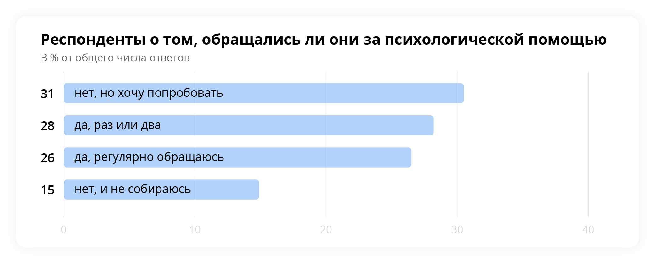 Большая же часть респондентов, хоть следит за своим эмоциональным состоянием, предпочитает справляться с трудностями самостоятельно. Это может быть обусловлено как финансовой стороной вопроса, так и отсутствием в России устоявшейся культуры посещений специалиста — хотя при этом за время пандемии количество таких обращений в Петербурге выросло на 30 %.