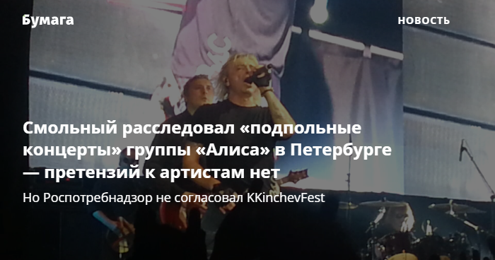 При этом в комитете отметили, что большой рок-фестиваль KKinchevFest, который должен состояться 3 и 4 сентября 2021 года, не получил обязательное согласование от Роспотребнадзора. Согласно сайту фестиваля, на фестивале должны выступить «Алиса», КняZz, 25/17, «Аффинаж» и другие группы. Билеты стоят от 2,5 до 14,8 тысячи рублей. Сообщалось, что мероприятие должно пройти в «Севкабель Порту». «Бумага» направила запрос в пресс-службу пространства.