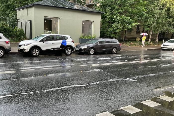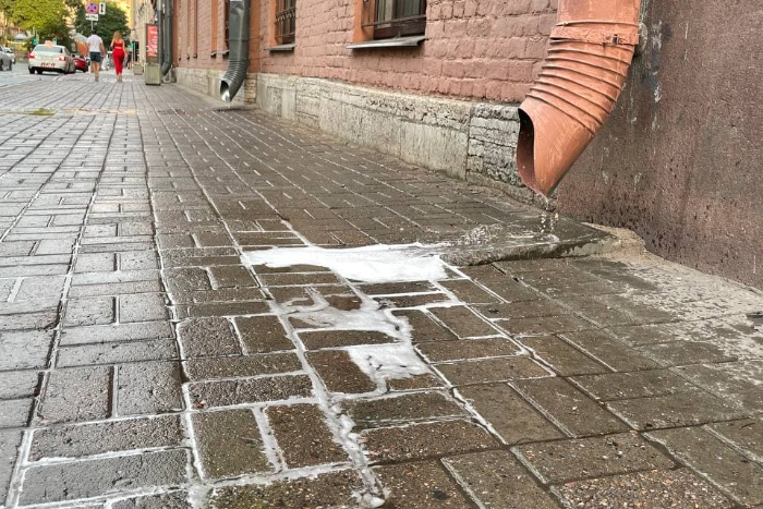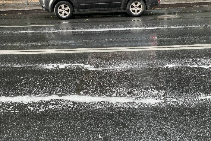 — Дождевые струи превращаются в мелкие пузырьки, которые со стороны выглядят как белый химический налет. По словам экологов, в воздухе накапливается мелкая пыль, которая дождем прибивается к асфальту и дает такие разводы. Играет роль и высокая температура дорожного полотна.