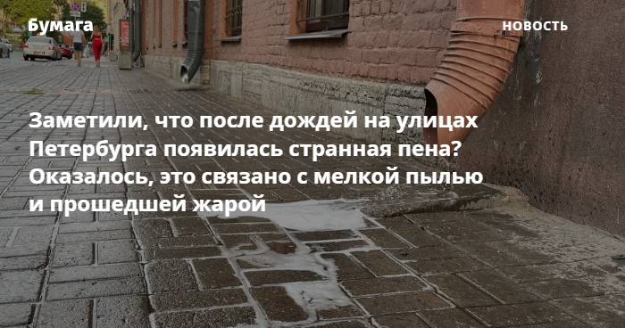 Как объяснили «Бумаге» в комитете по благоустройству Петербурга, данная пена — эффект от дождя, которого ранее не было. На его возникновение повлияли мелкая пыль и аномальная жара.