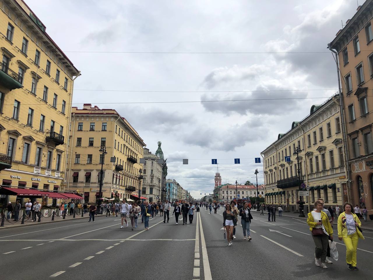 А вот Невский проспект, который временно стал пешеходным, похоже, пришелся людям по душе. По перекрытой улице гуляют десятки человек, многие фотографируются, сидя на асфальте.