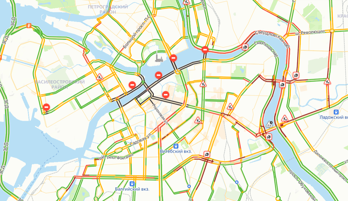 Из-за репетиции центр города перекрыт. Вот как выглядит карта Петербурга в сервисе «Яндекс.Пробки». Заторы небольшие и составляют около 5 баллов, но на некоторых набережных ситуация напряженная.