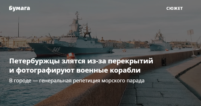 В Петербурге в этот четверг проходит генеральная репетиция военно-морского парада. Горожане выходят на набережные, чтобы полюбоваться кораблями. Вероятно, 25 июля, в день самого праздника, это сделать не удастся — недавно Роспотребнадзор сообщил, что мероприятие пройдет без зрителей.