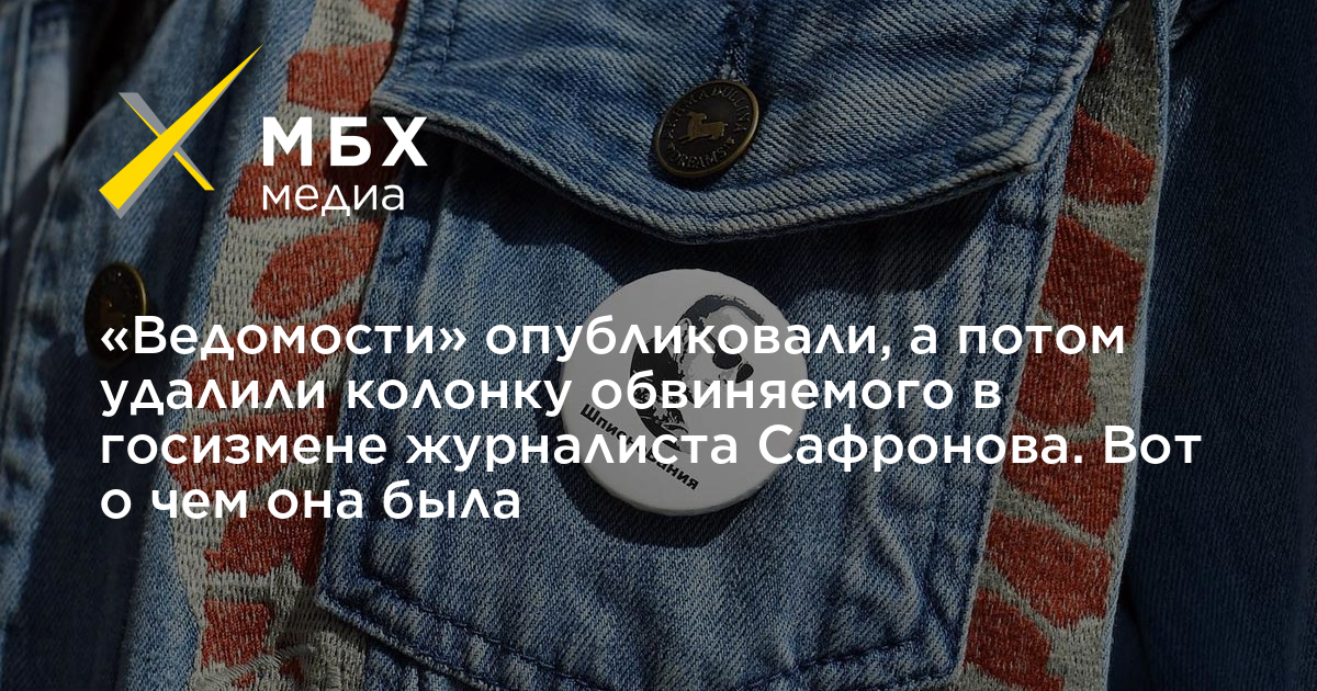 Бывший журналист издания «Коммерсантъ» Иван Сафронов, находящийся сейчас под следствием по обвинению в государственной измене, — ФСБ утверждает, что его якобы в 2012 году завербовали чешские спецслужбы, — написал колонку для «Ведомостей». В ней журналист рассказал, зачем российскому государству нужно обвинять своих граждан в шпионаже. Спустя некоторое время колонка Сафронова с сайта «Ведомостей» исчезла, однако «МБХ медиа» успело ознакомиться с текстом журналиста.
